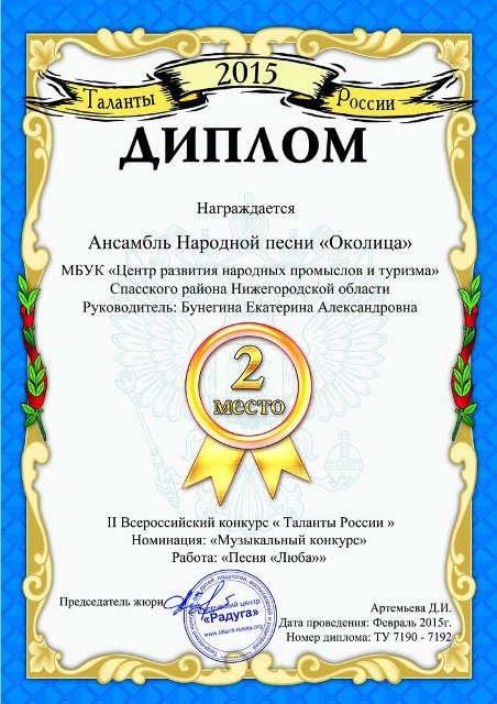 26 марта наш ансамбль "Околица" и солистка ансамбля Апполонова Татьяна приняли участие в международном конкурсе - фестивале "Волга в сердце впадает мое". Конкурс оценивало жюри в составе: Доктор искусств Международный Академии наук Сан-Марино. Профессор кафедры народного-певческого искусства Московского Государственного Университета Культур
