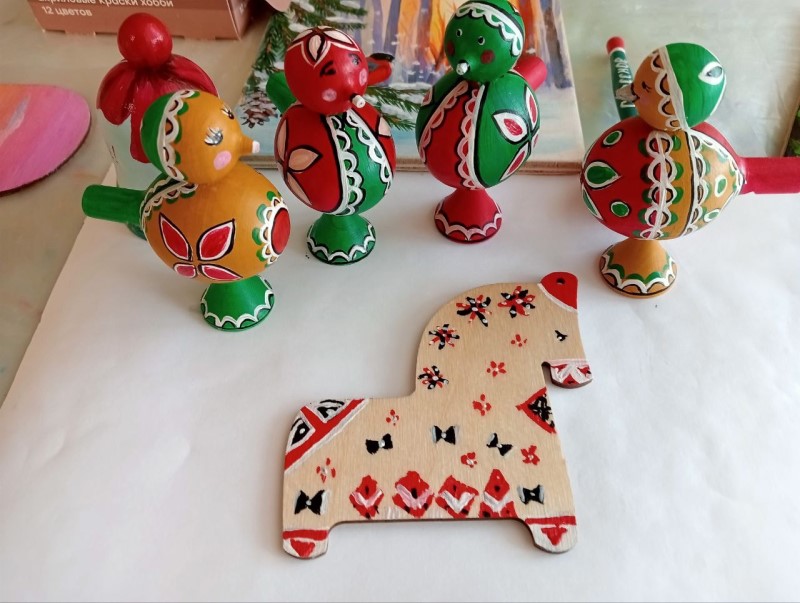 В росписи используются только два цвета: чёрный и красный. Характерен геометрический орнамент из ромбов, дисков, волнистых линий и крестов.