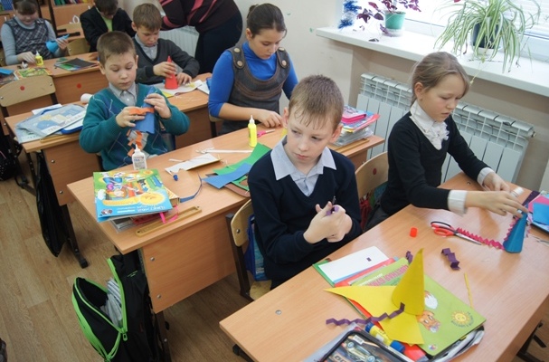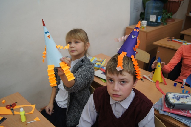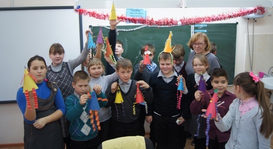 Весь класс мастерил своего «огненного петуха»: зеленого, красного, голубого. Ребята изготавливали сувенир для украшения своего класса.