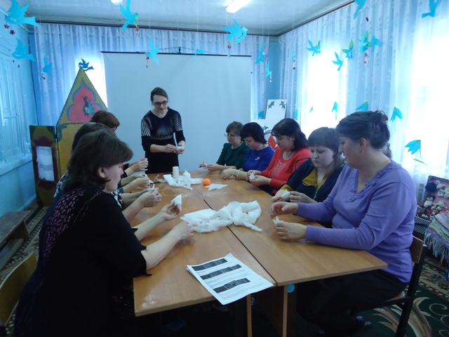 Сотрудника Центра развития народных промыслов и туризма приняли участие в районном методическом объединение воспитателей (детский сад «Солнышко»). Руководителям и воспитателям районных детских садов была показана презентация о работе центра и проведён мастер-класса по кукле – оберегу «Жаворонок». Также участники объединения ознакомились с работами декоративно-прикладного искусства наших мастеров. | |